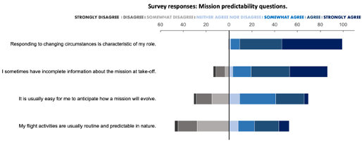 The survey responses showed that reported levels of unpredictability were generally high across operational types. 99% of respondents agreed that changing circumstances were characteristic of their role, with over half strongly agreeing with this statement. During a mission, 70% said that they found circumstances could change significantly on at least a regular basis, with 48% saying this happened frequently or very frequently in their operation. The most highly reported reason for this was a significant change to environmental or meteorological conditions, such as a task extending from day to night or the need to switch from visual to instrument flying due to deteriorating conditions.