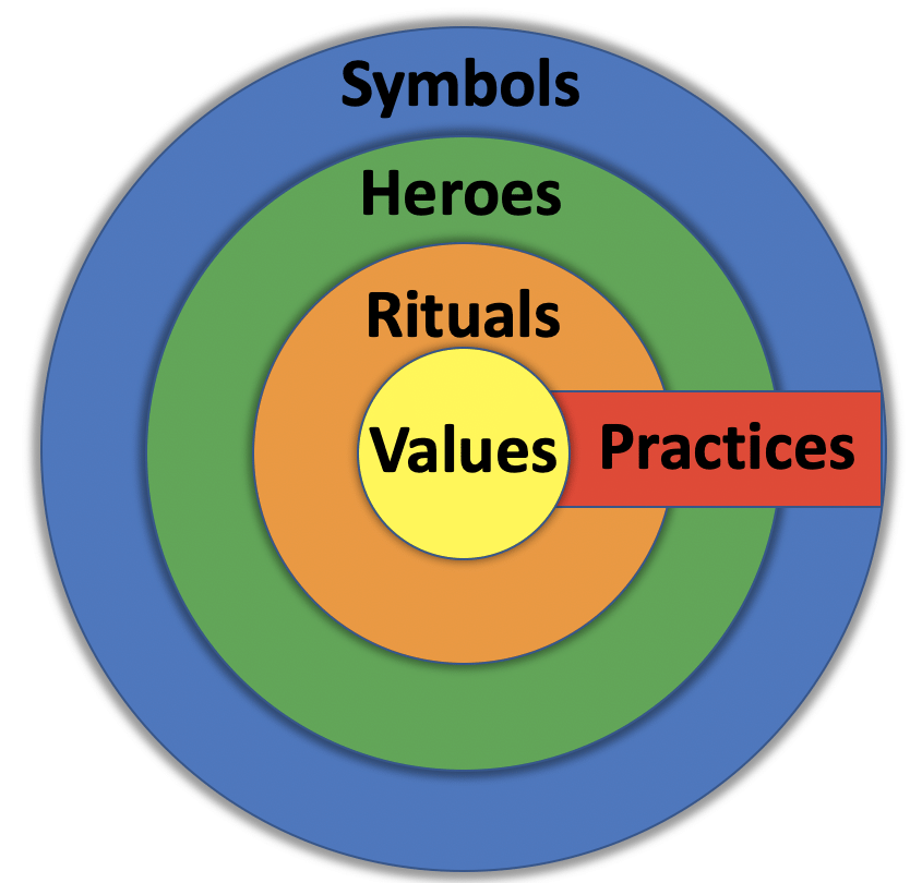 Why explain the constituent elements of culture in such detail? Because each has a different role in cross-cultural interaction. Rituals, heroes, and symbols together make up the practices of a culture. They are the parts of a culture that are visible to the outside observer. Practices form the parts of other cultures that we might stereotype and poke fun at, but it is values – the core – (which remains mostly hidden below the surface) that are most significant in inter-cultural communication.