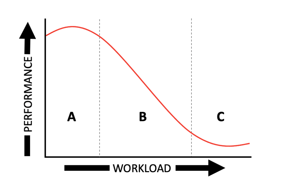 Any conscious mental processing we do that focuses our attention results in cognitive workload. Workload management is about maintaining a balance between level of demand and the mental effort required to meet that demand based on our available resources. Demand can go up, but resource can also go down (think startle, distraction, tunnelling). When demand outstrips resource the outcome is a decline in performance. This is shown in a basic illustration at Figure 1. The red line describes cognitive capacity. In Zone A the pilot has sufficient to maintain performance as task demands begin to increase. In Zone B task demand is such that workload begins to overcome cognitive capacity and performance declines as a consequence. By Zone C, workload has exceeded the pilot’s capacity to such an extent that task performance is almost completely negated.
