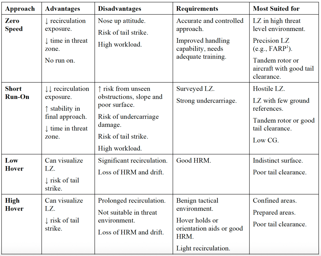 - Low Hover and Land. This approach might be required if the crew is uncertain about the quality of the landing surface at an unfamiliar site, but should be avoided if possible as it can create the most intense dust recirculation and disorientation. If this approach is chosen then underlining the role of crew co-ordination and an early call to go-around is even more important.